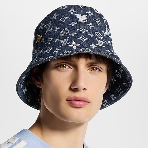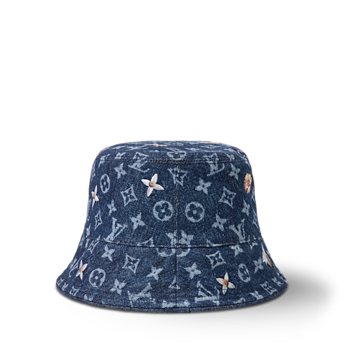 The Monogram Flower denim bucket hat is a contemporary silhouette with refined embellishments. The 100% cotton style is crafted from a timeless denim wash adorned with a Monogram pattern. A handful of flowers is embroidered in white and yellow, balancing the masculine silhouette with a sweet softness.