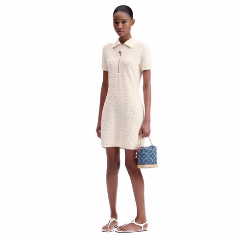 This chic polo dress is crafted from plush cotton-wool blend toweling that is discreetly signed all over with Monogram Flowers in relief and finished with ribbed hems. It is crafted in a casual short-sleeved shape with a sporty flat collar and a golden zipper on the chest, which is trimmed with a Monogram canvas pull.