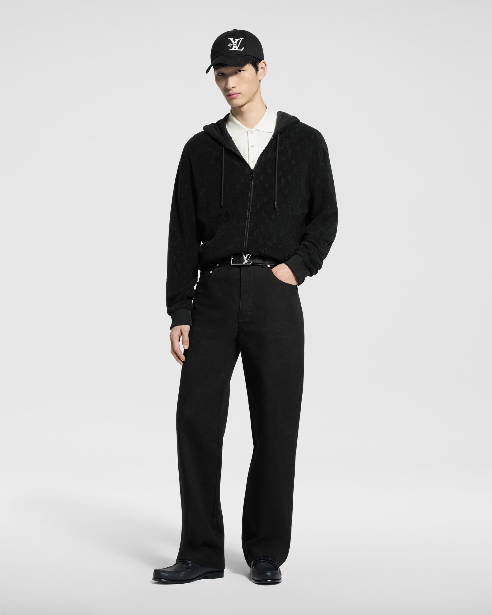 This black zip-through hoodie made from soft French terry is both comfortable and refined, making it ideal for relaxing after the beach. The spongy cotton-blend fabric is distinguished with an allover debossed tonal Monogram signature. This piece can be worn as a set with matching shorts.