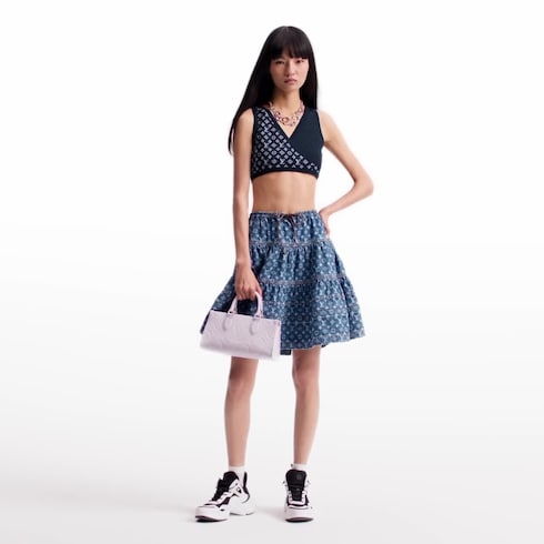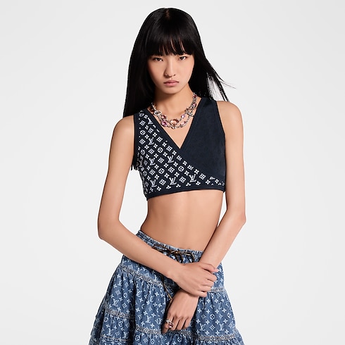 This crop top makes a sporty everyday statement in a soft silk-blend knit in a timeless shade. The fitted, sleeveless shape is crafted with a cross-over front, which is highlighted on each side with a graphic Monogram jacquard in contrasting tones for a bold signature finish.