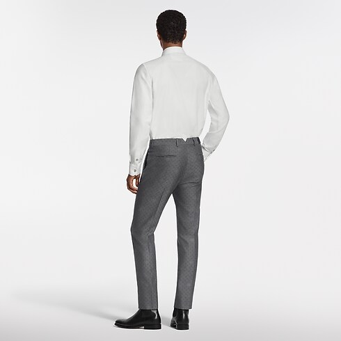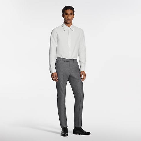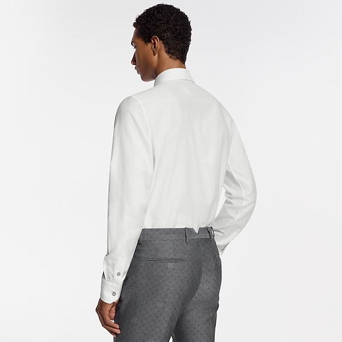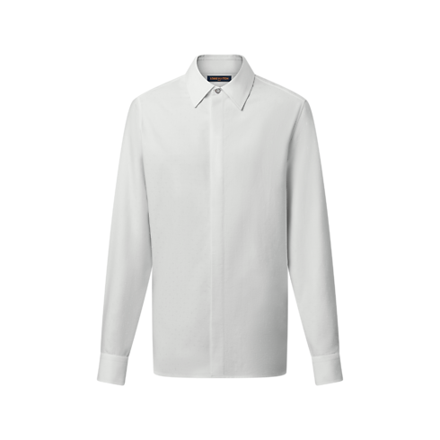 This elegant white evening shirt is crafted from fine organic cotton. The minimalist silhouette, with a concealed button placket, is elevated with a tone-on-tone jacquard Spaced Mini Monogram motif. An LV button fastens the collar, while a tone-on-tone signature label signs the placket. This sophisticated piece can be layered with a suit in the same motif.