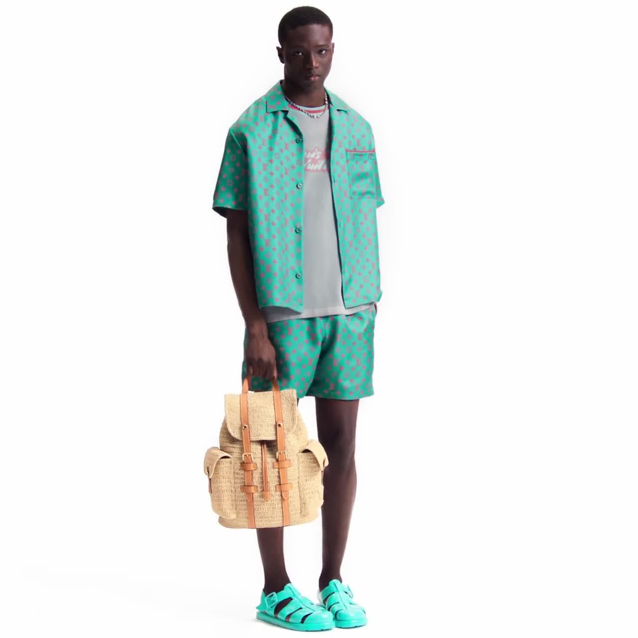 This luxurious short-sleeved silk shirt is adorned with a bold printed Monogram Glow motif, whose coral pink tones on an aqua base radiate vibrant summer energy. With its easy silhouette and open collar, this flowing piece transitions effortlessly from daytime looks to evenings by the hotel pool. Matching shorts make a chic set.