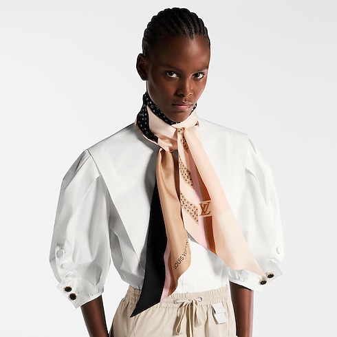 The all-silk Nano Monogram Lavallière stole embodies the very essence of Louis Vuitton. Its eye-catching print combines the famous Monogram pattern with bands of vibrant color, recalling the custom detailing of the House’s historic trunks. Worn around the neck, as a belt or as a headband, this versatile accessory allows each wearer to express a bold personal style.