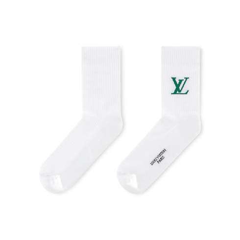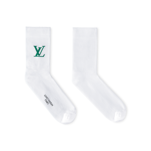 Ready for on-the-course competition or a clubhouse wind-down, this versatile pair of Only LV crew socks is distinguished in its simplicity. The House initials, knitted in green in celebration of the golf capsule, embellish the white cotton blend above the ankle, and LOUIS VUITTON PARIS is rendered on the arch of the foot.