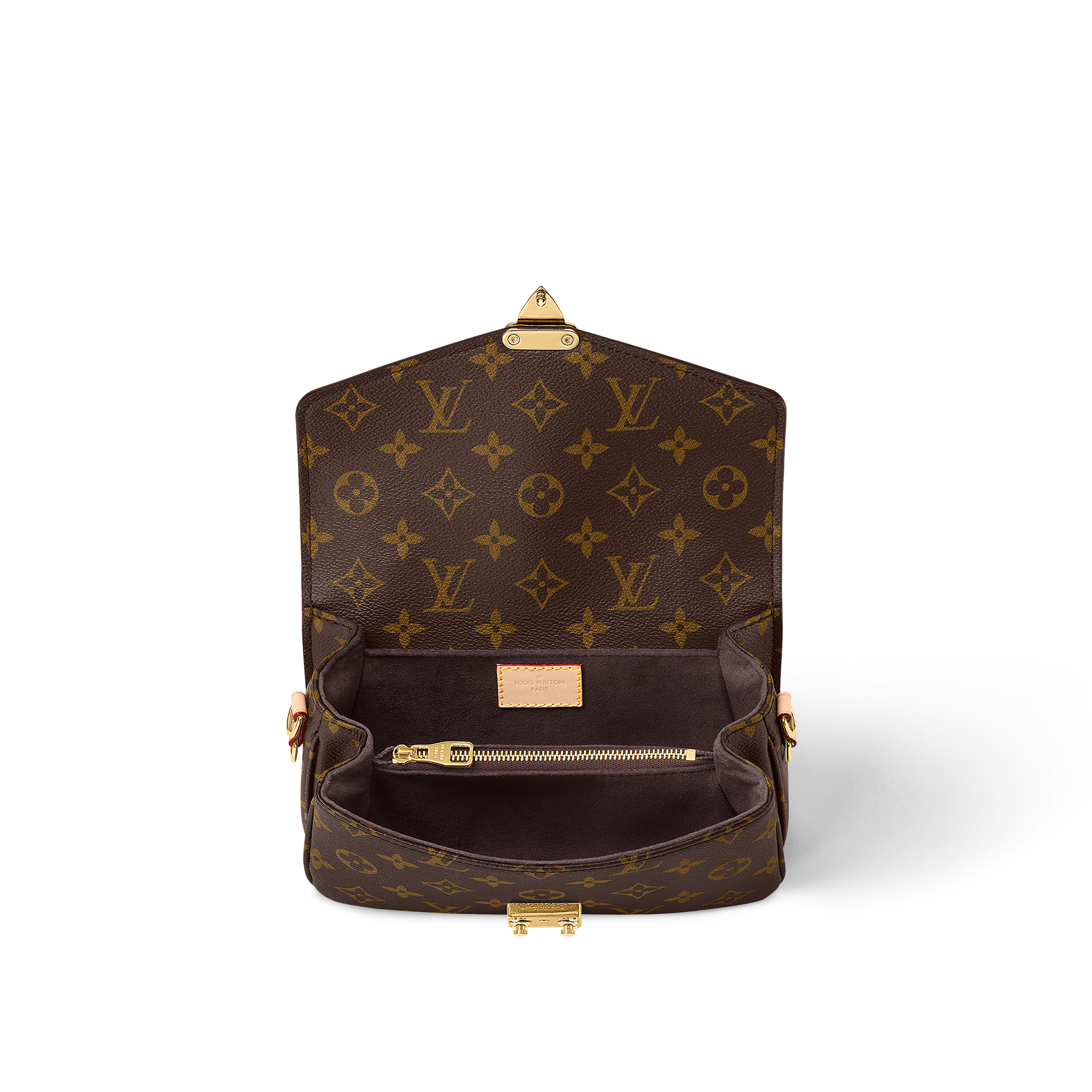 Made from Monogram canvas with natural cowhide-leather trim and the S-lock signature, the Pochette Métis East West bag combines emblematic House cues with new contemporary details like a gold-color chain for fashionable short-shoulder carry. Roomy enough to store a smartphone, it has three inside compartments, a zipped pocket inside, and another outside.