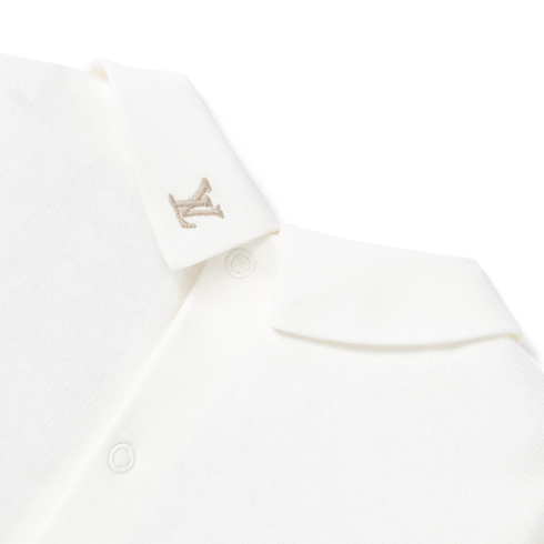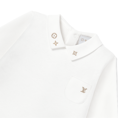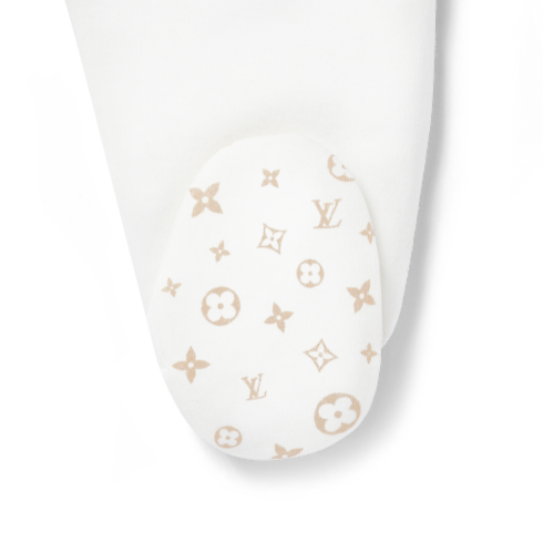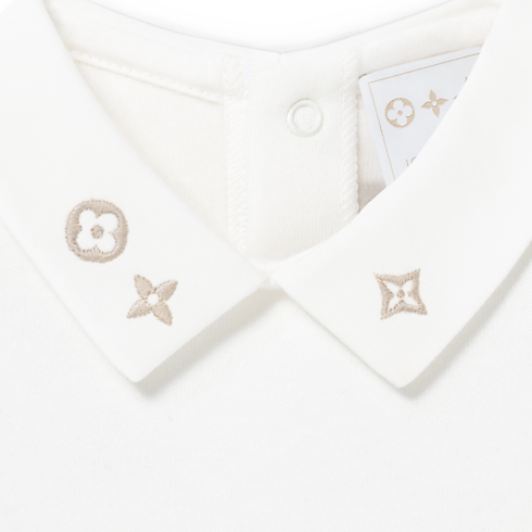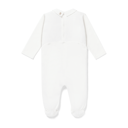 The Round-Collar Pyjamas are part of the Louis Vuitton Baby collection. Crafted from pure, soft cotton, they are embroidered on the pocket with the LV Initials and on the collar with Monogram Flowers. Printed under the feet is the playful Meli-Melo pattern of multicolored Monogram Flowers, which is a signature of the collection. This delightful piece is an ideal gift for a newborn.