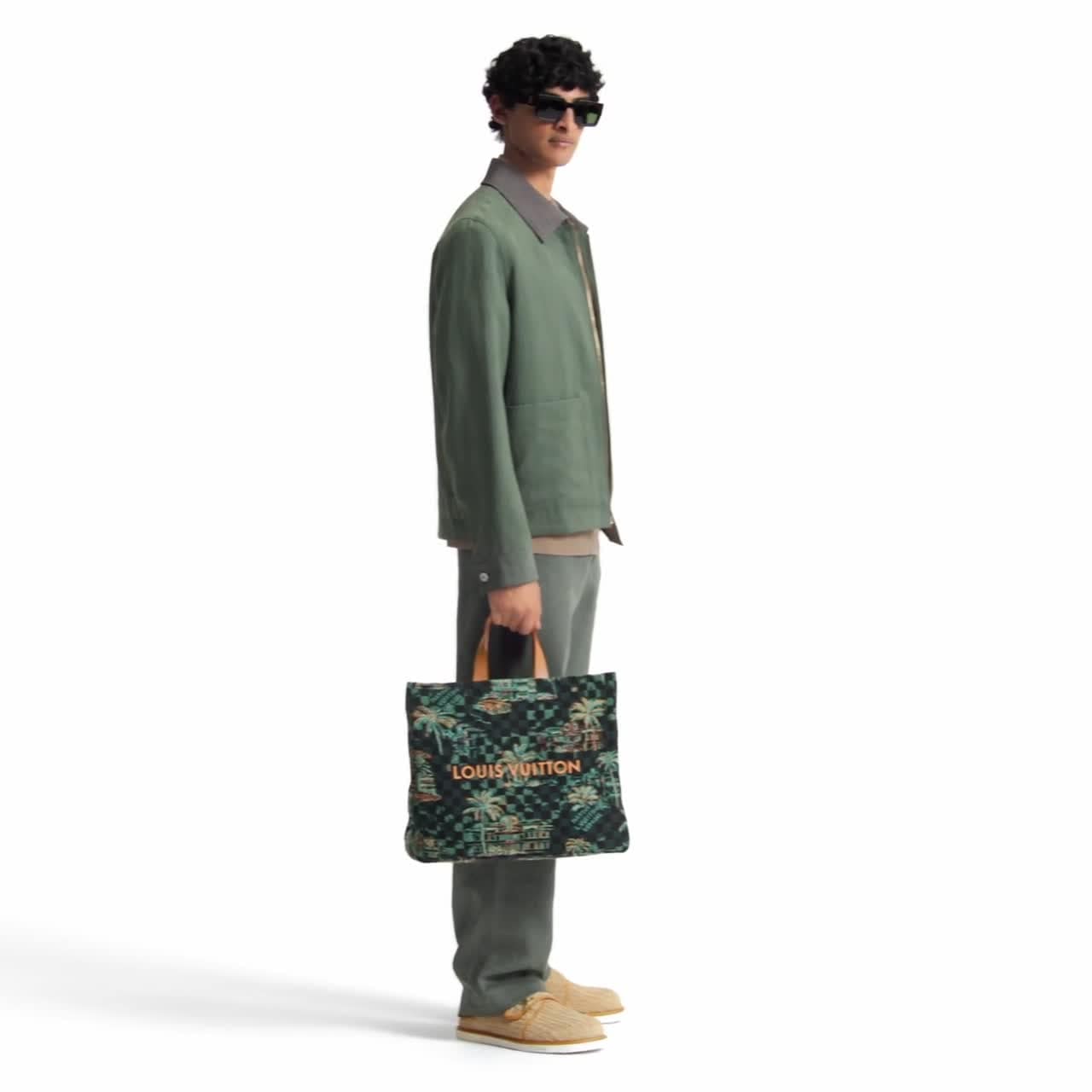 This Shopper Tote in jacquard cotton features a motif inspired by vintage Miami postcards. Capturing the city's vibrant nightlife, the pattern showcases Miami symbols such as palm trees, iconic buildings, and a vintage car on a Marina blue background. Almost hidden in this sumptuous decor is the iconic “Marque déposée L.Vuitton” signature, embraced by Pharrell Williams.