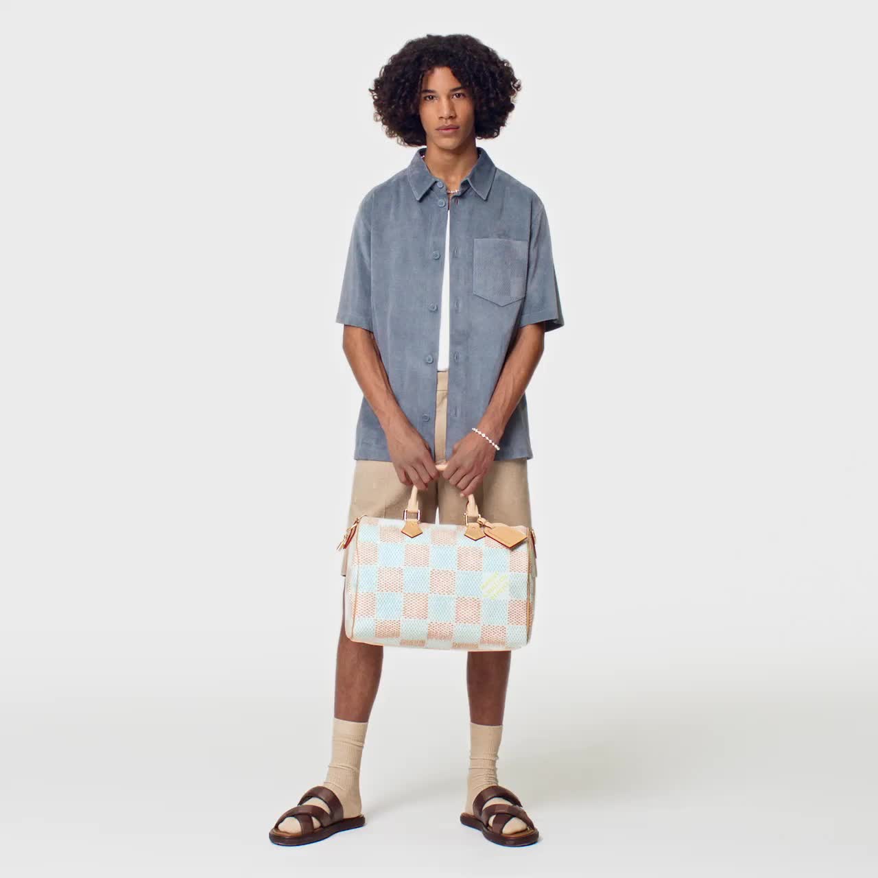 This short-sleeved overshirt in light suede is a contemporary piece discreetly embellished with a debossed Damier pocket on the chest and a ‘Marque L.Vuitton Déposée’ leather patch on the back. The elegant blue-grey color easily mixes with timeless separates.