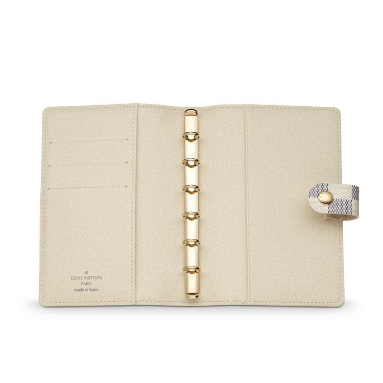This elegant Damier Azur canvas agenda holds credit cards and features a press stud closure.