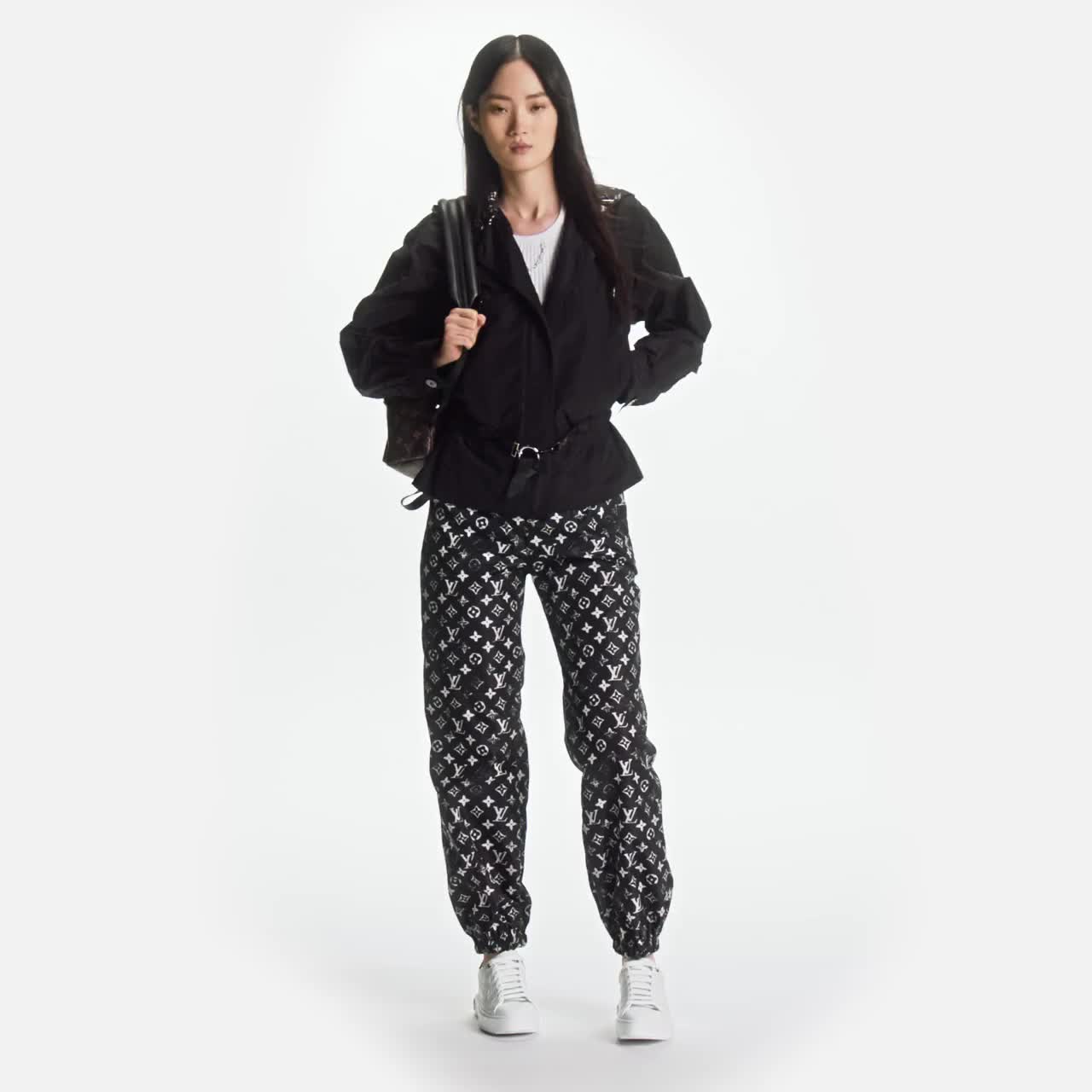 This casual piece combines a sporty vibe with a graphic Louis Vuitton signature. Tailored from technical fabric, it is adorned with the House’s iconic Monogram motif, updated with a distinctive stencil effect. Details include a hook closure, elasticated ankles and waist, and two zipped pockets on the sides.