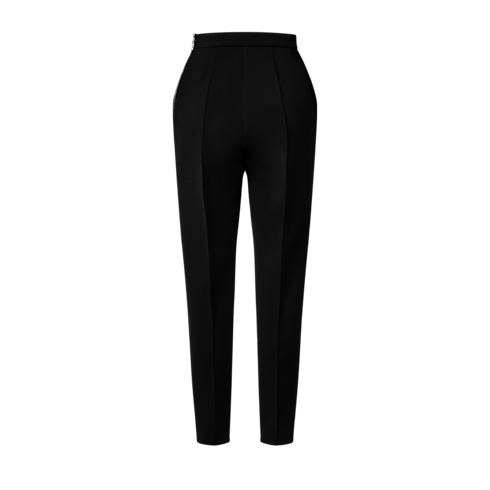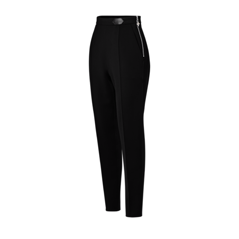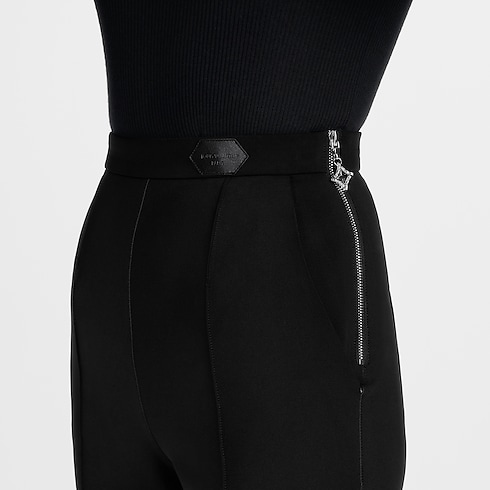 These pants are cut from technical jersey in a sleek figure-skimming silhouette complete with stirrups at the ankles for a secure fit. Stitched seams on the legs add a dressy detail, while the waistband is discreetly signed with a leather Louis Vuitton patch and fastened at the side with an exposed zipper trimmed with a snowflake pull.