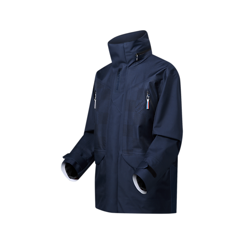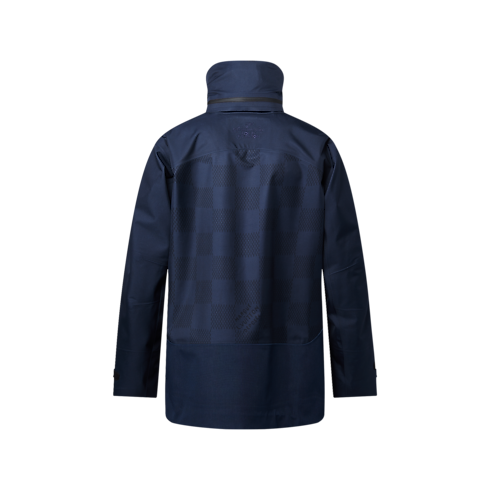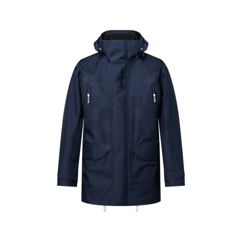 Featuring a panoply of technical details, this navy blue mid-length parka inspired by the Louis Vuitton 37th America’s Cup provides elegant protection, whether navigating across oceans or through cities. Constructed from five different fabrics with a 20k waterproof rating, its features include a Damier motif incorporating ‘Marque L. Vuitton déposée’ signatures on the body, a tall collar with a retractable hood and taped zipped pockets with tricolor rubber Gaston pullers.