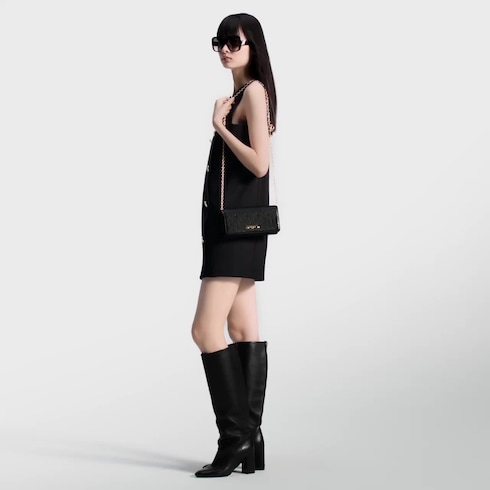 The Lily wallet on chain is crafted from supple, grained Monogram Empreinte leather. This tiny flap bag, which will hold essentials for day or evening, combines a sleek rectangular shape with a subtle retro look. It is complemented by gold-tone hardware, notably a Louis Vuitton-engraved plate and a removable, adjustable chain with an LV Circle charm.