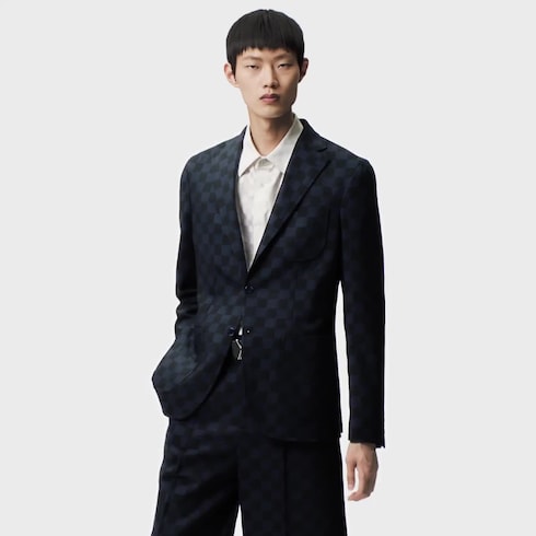Inspired by Italian tailoring for a more relaxed attitude, this effortless jacket is softly structured and unlined, making it light and easy to wear. The stretch wool suiting features a graphic Wavy Damier jacquard with discreet LVs in blue and black tones for a modern reinterpretation of the Maison's heritage signature. This elegant yet relaxed piece can be worn as a contemporary summery suit, paired with shorts in the same motif.