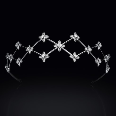Singularly exploring the pristine white beauty of diamonds, Élégance pays homage to the art of tremblant — multiplying the brilliance of the refined creations. The Maison's signature V unfurls in a graphic interlocking pattern, sprinkled with LV Monogram Star cut diamonds, as a focal point for the Maison's first tiara.