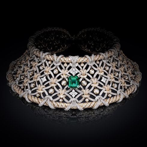 Séduction unveils unprecedented intricacy, celebrating the burgeoning textile and passementerie expertise of the period. Precise details like the V shape, cord-style fringing, and Monogram Kite motif recall the Maison's historic codes, culminating in one of the most impressive necklaces of the collection — featuring an incredible 12.92-carat Zambian emerald, totaling 4,200 hours of work.