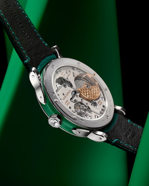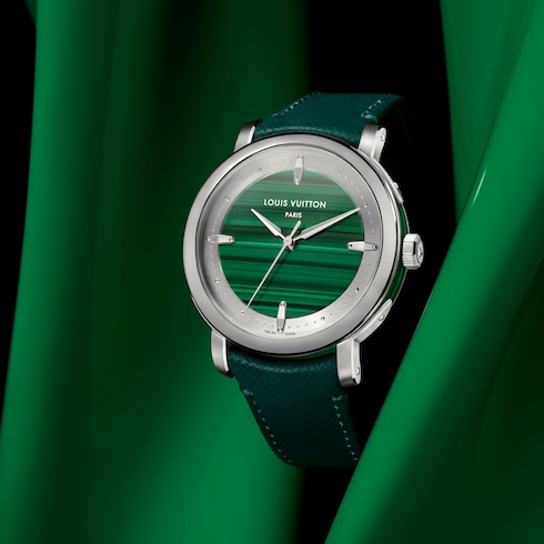 Louis Vuitton Escale Malachite is defined by its fine mineral banding, revealing deep green tones and variegated layers. Powered by the LFT023 movement, each 40mm timepiece is set with ornamental stones finished with utmost care through a delicate polishing technique that reveals their brilliance.
