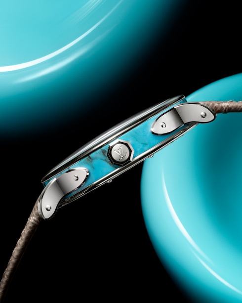 Louis Vuitton expands the Escale collection, unveiling limited-edition platinum watches in turquoise and malachite. Natural ornamental stones shape both dial and middle case, celebrating the abundant beauty of nature through a vibrant design that embodies the House's audacious spirit of savoir-faire, imagined by Artistic Director Matthieu Hegi in collaboration with the artisans of La Fabrique du Temps Louis Vuitton.